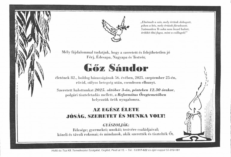 Kedves Sanyi! Kollégáim és volt gimnazista társaim nevében búcsúzom Tőled. Értetlenül állunk itt a ravatalodnál, mert nem hisszük el, hogy veled is megtörténhetett, hogy fogást talált rajtad a halál, rajtad, aki annyi nehézségen verekedted át magad, annyi küzdelmet vívtál életedben. Rád mindig számíthatott a családod, számíthattak a kollégáid. Ahol kellett, ott voltál és segítettél. Az állandó tevékenykedés jellemezte egész életedet. MEGHÍVÓ - 2025. szeptember 16.2025.09.12. 18:12 Lejár 2025.10.26. 23:59