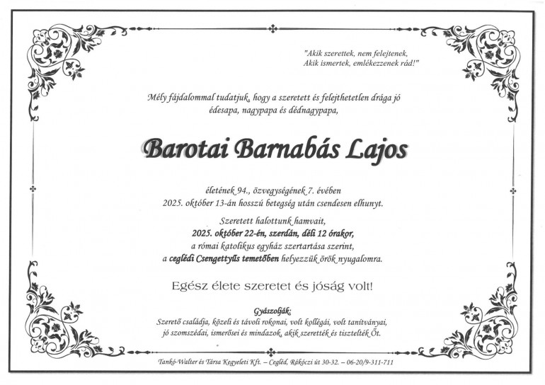 ![]() Mély megrendüléssel tudatjuk, hogy Barotai tanár úr 2025. október 13-án elhunyt.